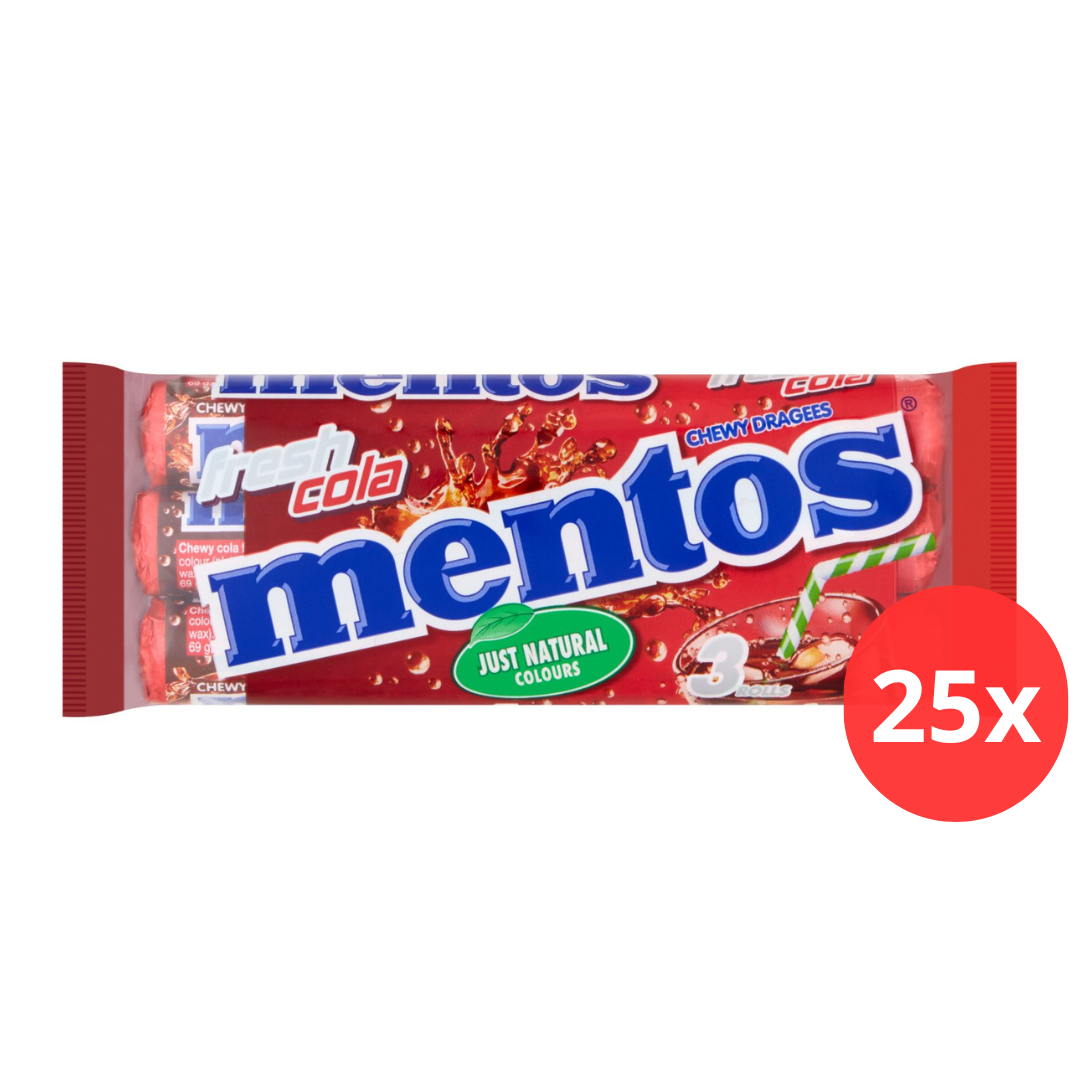 Geniet van de Mentos Cola rol, een heerlijk kauwbaar snoepje met een verfrissende cola smaak!