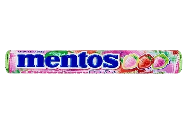 Mentos Aardbei Mix, 3 soorten Aardbeisnoepjes in 1 rol! De normale aardbei, een zure en een zoete.