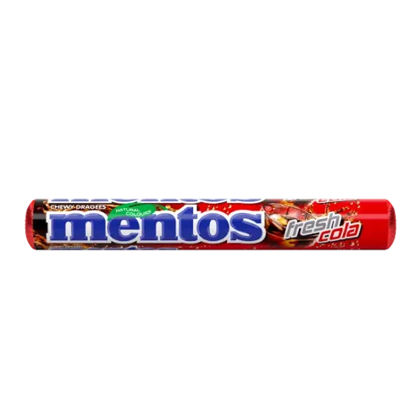 Geniet van de Mentos Cola rol, een heerlijk kauwbaar snoepje met een verfrissende cola smaak!