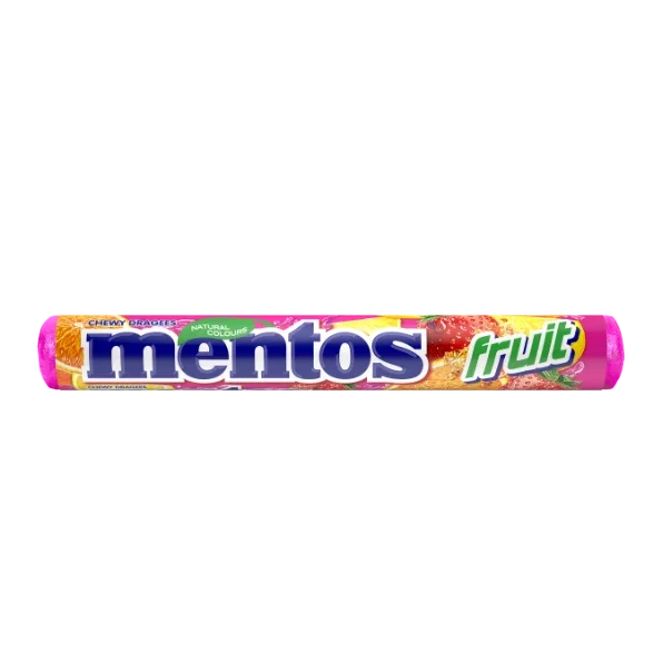 Mentos Fruit: zin in een fruitige frisheidskick? Deze handige rol bevat 14 heerlijke snoepjes in een vrolijke mix van aardbei, citroen en sinaasappel. Perfect voor onderweg of gewoon als je even wilt genieten van een fruitige smaakexplosie!